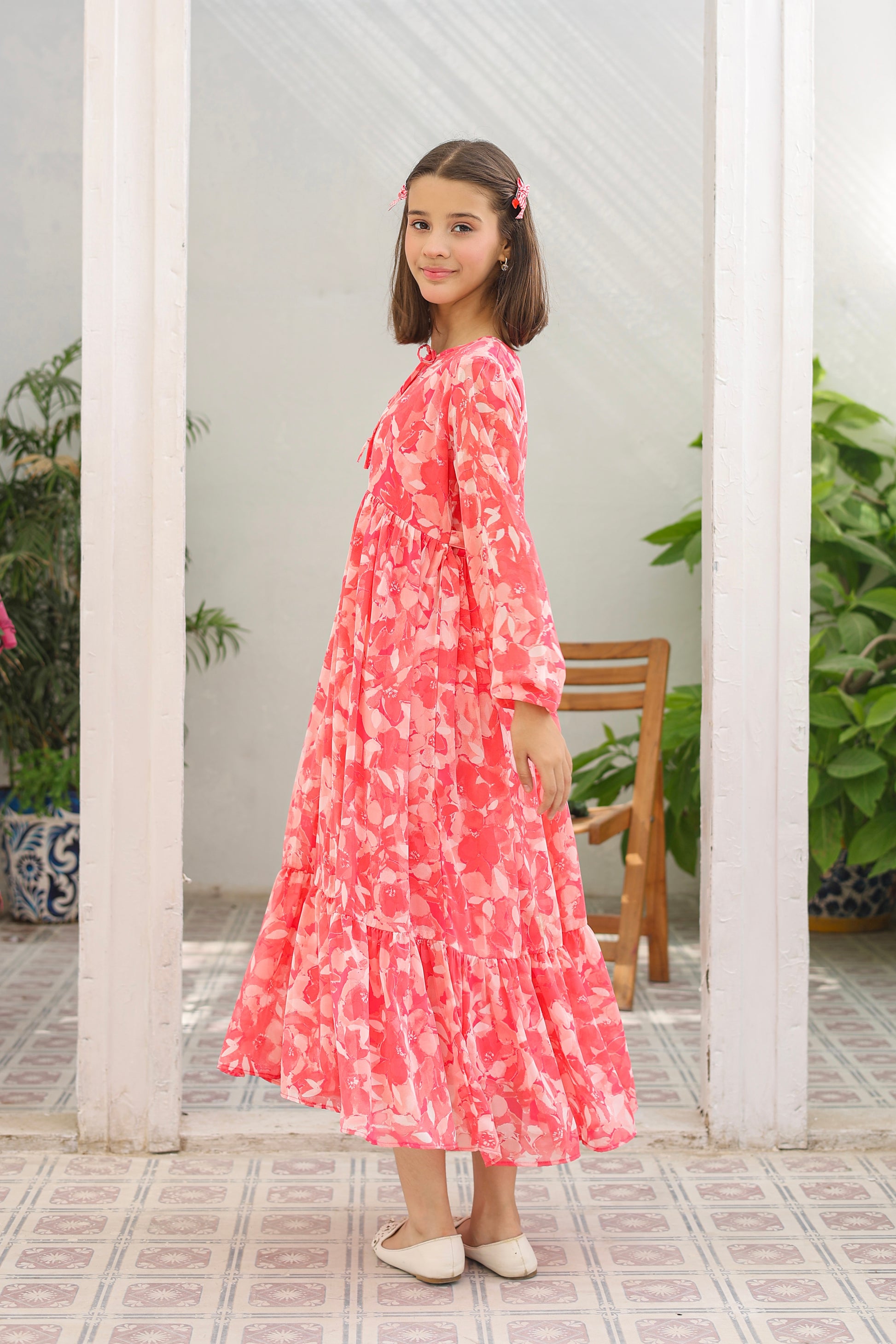 Coral Bloom Maxi from Little Folks is a true wardrobe delight. Designed in soft chiffon with a vibrant coral and pink floral pattern, this flowy maxi dress captures the joy of summer blossoms. Its relaxed fit with gentle gathers and a tiered hem adds volume and charm, while the tie-neck detail gives it a graceful touch.