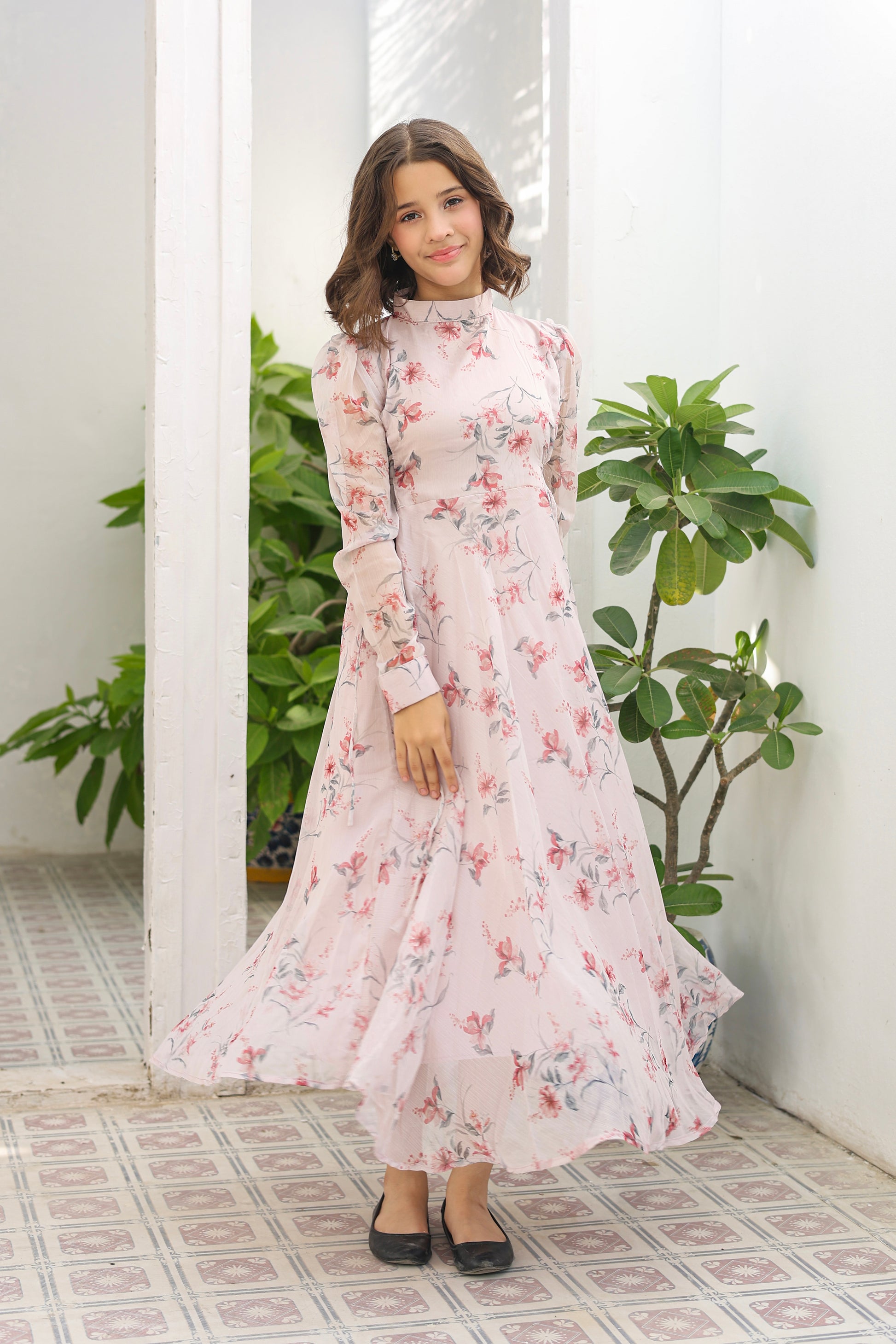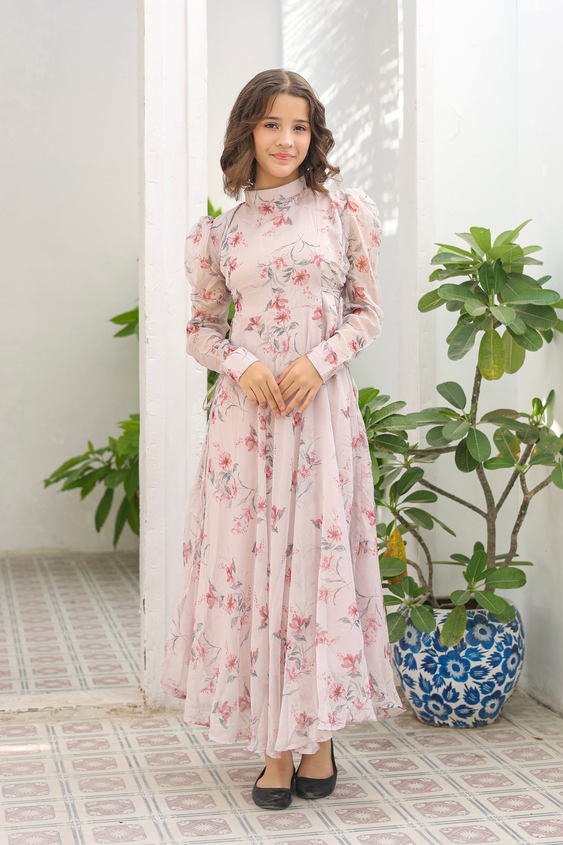 Step into a world of romantic charm with our Blush Floral Maxi. This elegant dress features a delicate, light pink background adorned with a soft floral print in blush and green tones. The high-neck, button-down bodice and flowy tiered skirt create a graceful silhouette that is both timeless and modern. Made from a lightweight, breathable fabric, this maxi dress ensures comfort and style for any occasion, from a romantic evening out to a daytime garden party. The long, puffy sleeves with ruched detailing add a touch of whimsical grace, making it a versatile piece you can dress up or down