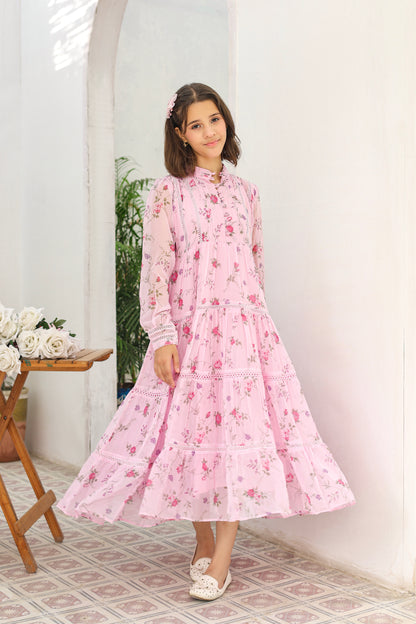 Graceful and dreamy, the Lilac Blossom Maxi from Little Folks is the perfect blend of elegance and charm. Crafted from soft chiffon, this maxi features a delicate lilac base beautifully decorated with tiny purple floral prints for a fresh, all-over look. The sharvani-style collar with matching fabric-covered buttons adds sophistication, while the wide gear gives the dress a flowing fall, perfect for twirling.Puffy bobbin sleeves bring a playful, voluminous touch, making the Lilac Blossom Maxi both stylish and comfortable. Ideal for birthdays, festive gatherings, or family occasions, it’s a timeless addition to your little one’s wardrobe.