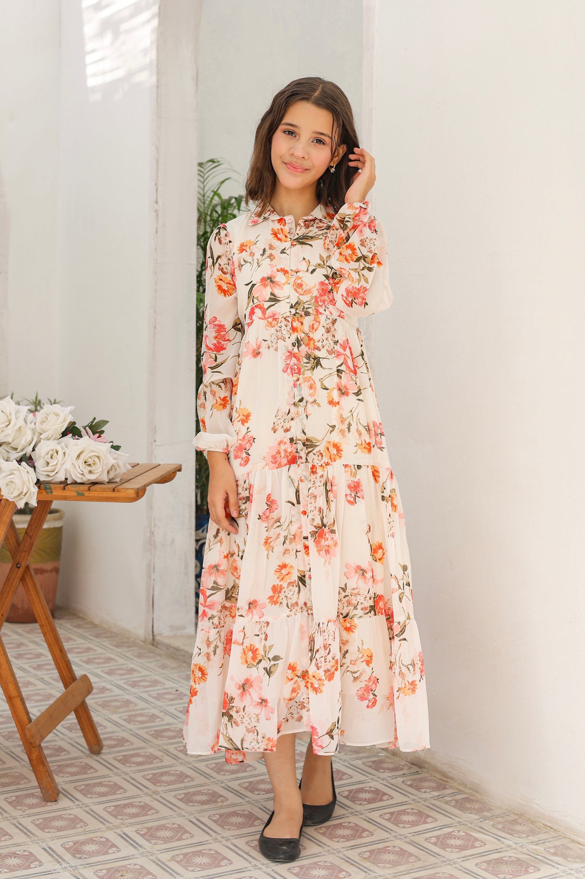 Bring a touch of springtime charm to your little oneβs wardrobe with the Peach Meadow from Little Folks. Crafted from lightweight chiffon, this elegant frock features a pure white base beautifully adorned with peach and orange floral bunches, accented by flowing green vines and leafy details for a fresh, garden-inspired look.Β Designed with a round dori gala collar, puffy sleeves with elasticated cuffs, and a row of fabric-covered buttons running gracefully from neckline to hem, the Peach Meadow offers timeless elegance. A playful three-step frill at the skirt adds volume and makes every twirl extra special. Perfect for birthdays, festive gatherings, or family celebrations, this frock blends comfort and sophistication effortlessly.